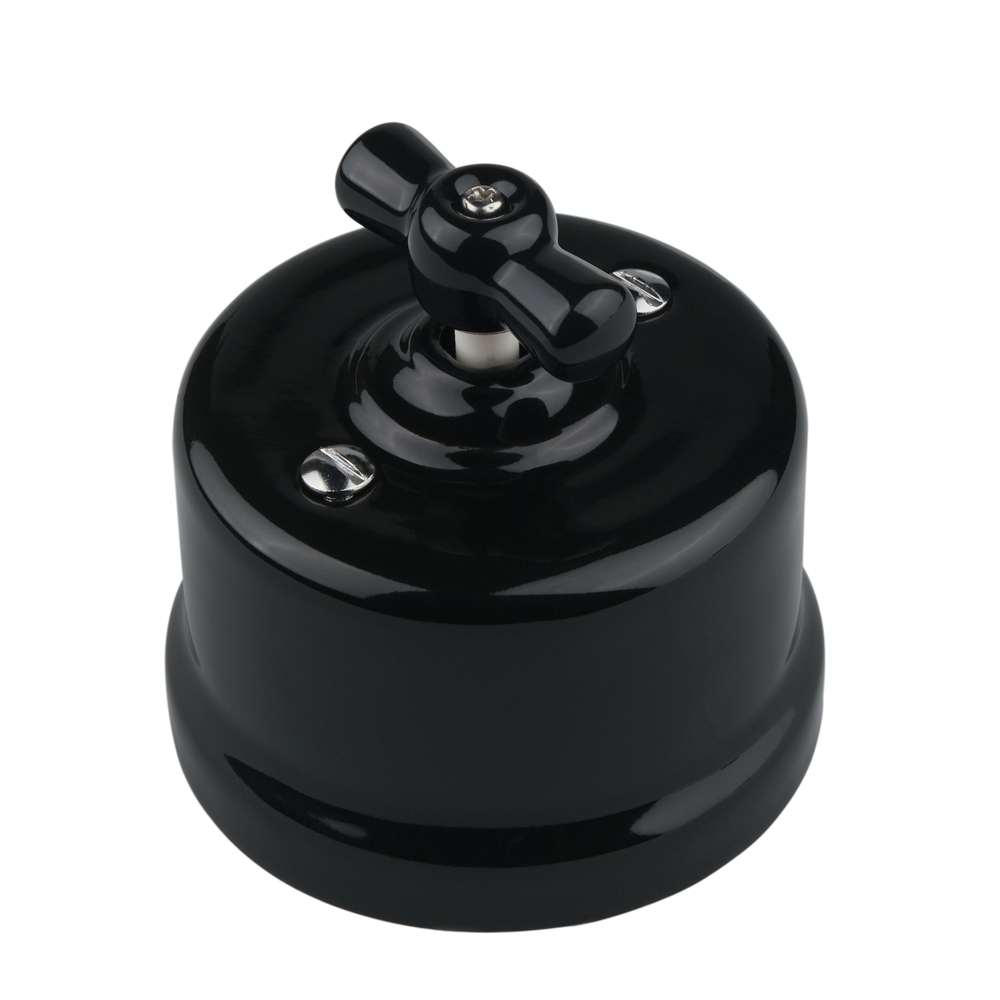 Fnd paviršinis sukamasis perjungiklis, juodas porcelianas, varžtiniai gnybtai, 10A, 250V, IP20.
